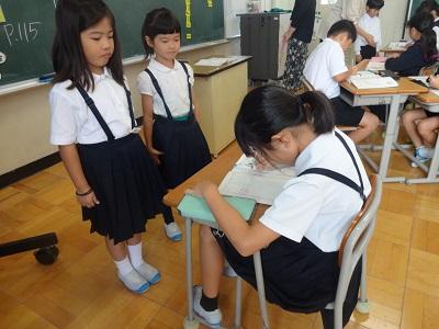 3.4年生の算数の授業の見学にいきました。学習リーダーを中心に自分たちで授業を進めている様子を見て、自分たちも頑張りたいと意欲が高まっていました。