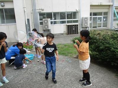 生活科の時間にしゃぼん玉をしました。うちわやモールなど道具を工夫して、大小いろいろなしゃぼん玉がたくさんできました。大きなしゃぼん玉が空に上がると、歓声がおき、みんな楽しそうでした。