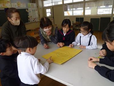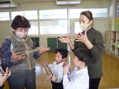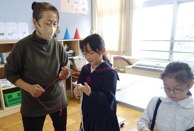 生活科「昔遊び」の学習で、二ツ谷さん、黒田さんにおはじきやあやとりを教えていただきました。おはじきは2人で対戦して盛り上がりました。あやとりは上手にできるコツを教えてもらい、何度も挑戦する姿が見られました。昔から続く遊びのよさを感じる時間となりました。