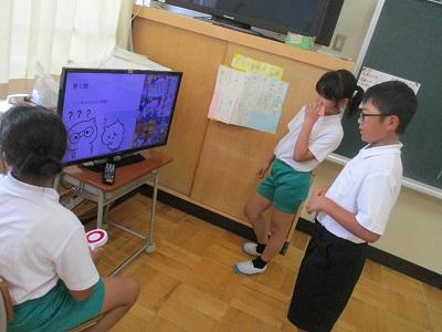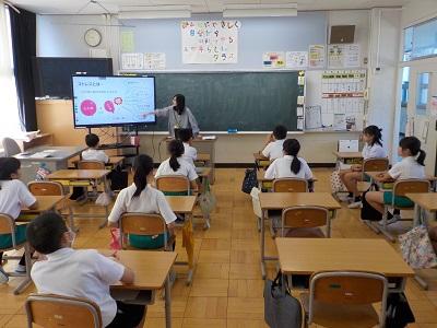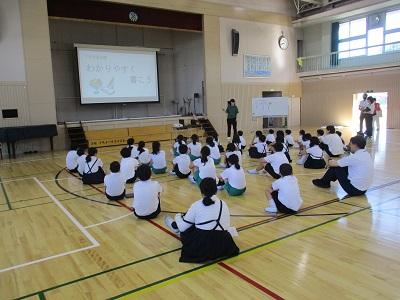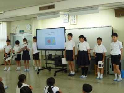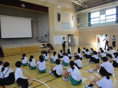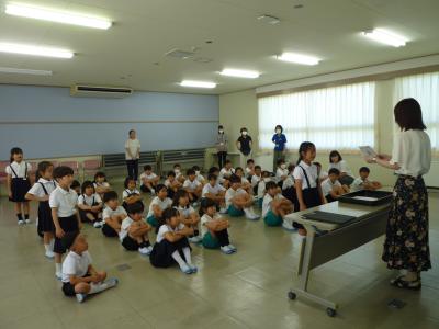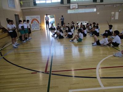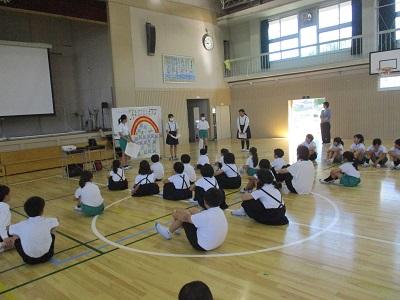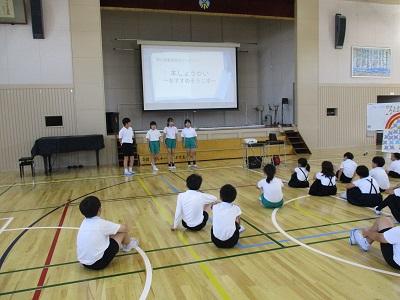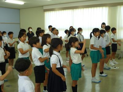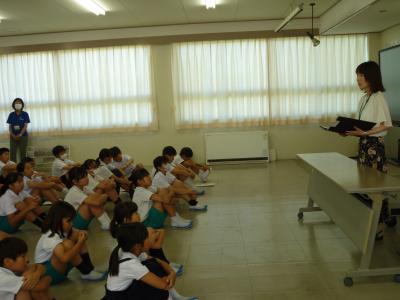 7月の集会も体育館で行いました。内容は①校歌、②校長先生の話「よく考える」(熱中症予防に関連して)、③学習目標の話「わかりやすく書こう」です。
