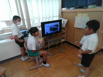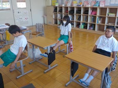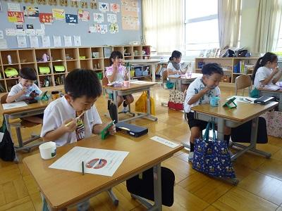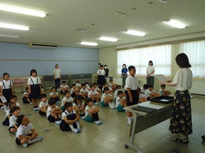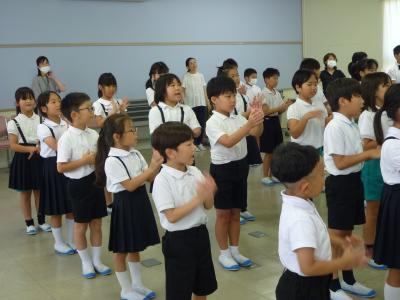 暑さに負けない元気いっぱいの校歌の後,『読書賞』と『にしっこチャレンジ』の目標を達成した児童に賞状を渡しました。続いて,校長先生の話,夏休みの生活の話があったのですが,真剣に聴く姿にも1学期の成長を感じました。