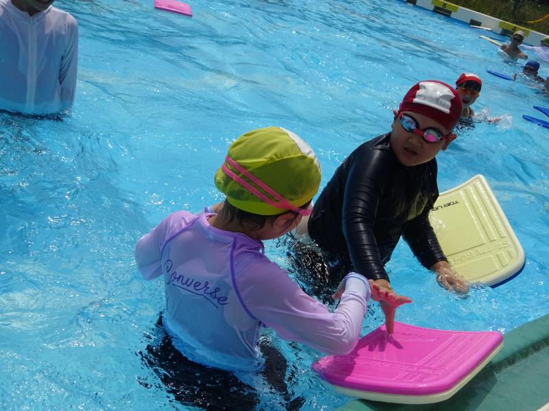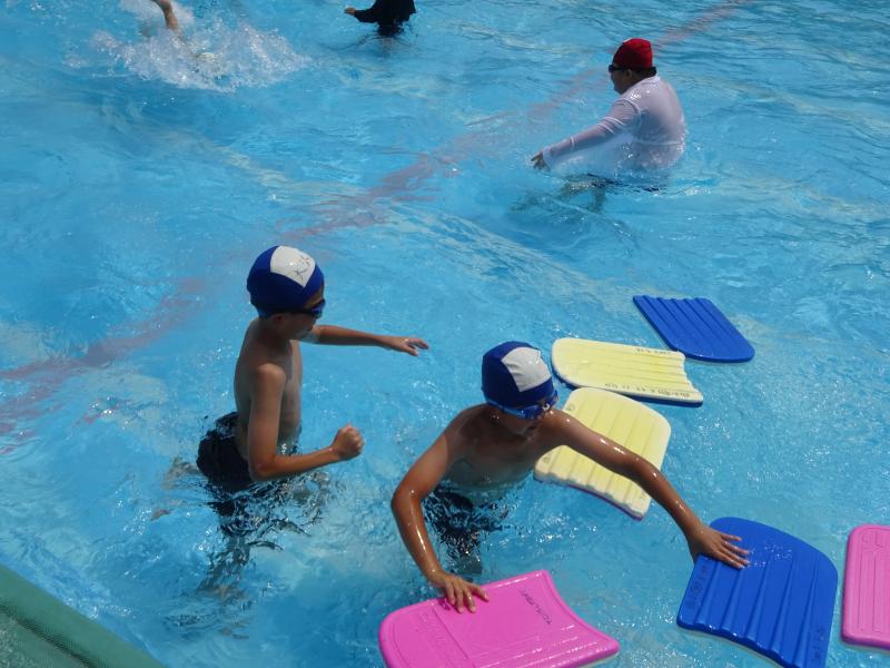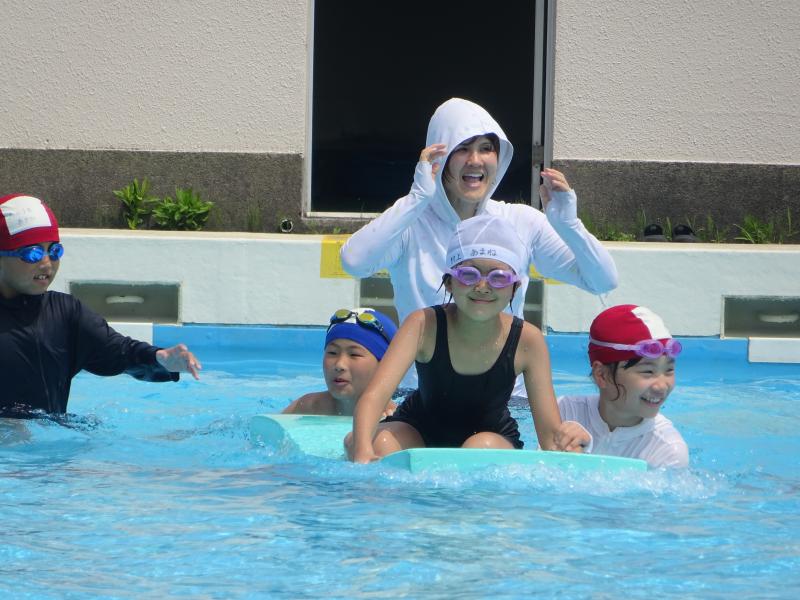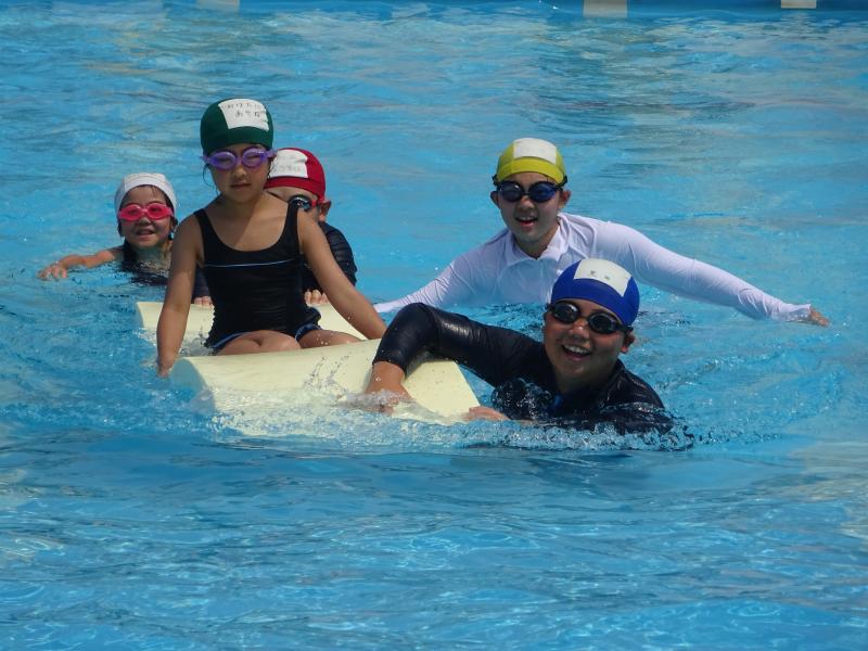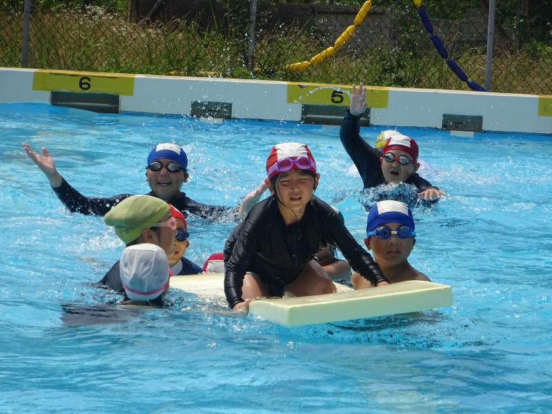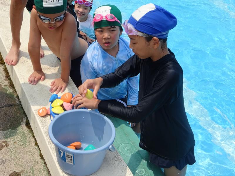 企画委員会がかねてから計画していた、プール集会を本日開催しました。赤白対抗で貝拾いをしたり、ビート板リバーシで競ったり、大きなビート板に乗った低学年をバトンにして、リレーで競争したりして、みんなで楽しい時間を過ごすことができました。