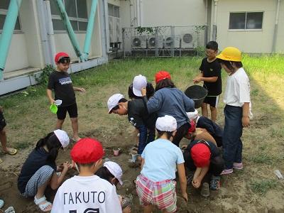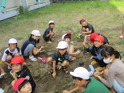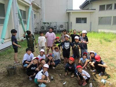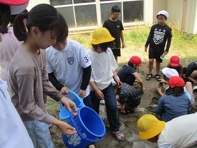 図工「すなやつちとなかよし」の学習で、どろんこ遊びをしました。山をつくったり、穴を掘ったりして、造形活動を楽しみました。6年生が何度もバケツで水を運んでくれたおかげで、1~3年生は遊びに夢中になっていました。