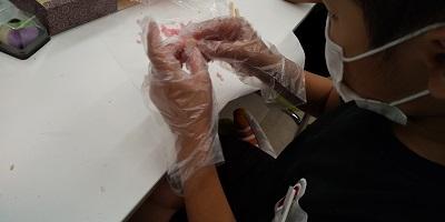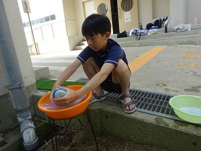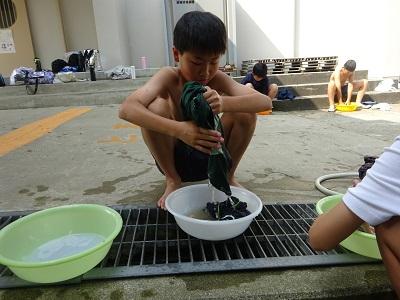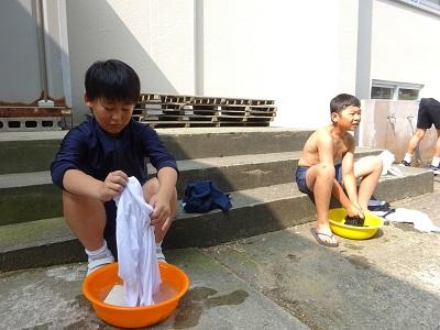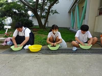 家庭の授業で洗濯の実習をしました。昨日どろんこ遊びで汚れた服やくつ下を手洗いします。「なかなかとれん。」「水が茶色くなった。」と言いながらも洗い方を工夫して洗い、すすいでしぼって干しました。手洗いの大変さを感じる体験となりました。