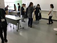 まず全員お揃いのエンジ色ポロシャツと緑スカーフを身につけ、弘毅篤学のスクールカラーのタオルを目印に集合して受付を済ませた後、別フロアに移動して、他校と協力しながら1500部の資料の封筒詰め作業を行いました。たくさんの資料を手提げ袋に入れる作業は、いかに効率よく行えるかチーム力を発揮する場面でした。その後、分科会のイートインコーナーの世話係(消毒や案内等)を担当しました。