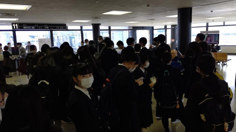 1日目の出発の様子です。あいにく冷たい雨の中での出発になりました。道中が密にならないように、1クラスが大型バス2台ずつを使用して、一路、伊丹空港・神戸空港を目指します。(いってらっしゃーい!)