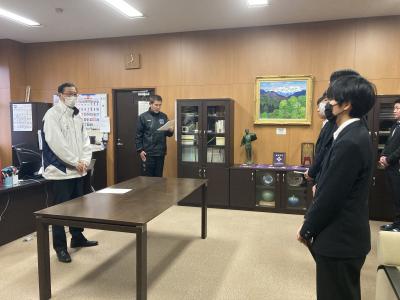 表敬訪問には、一般男子初段(組演武)にて優勝した小松工業高校2名、校長先生、県少林寺拳法連盟役員の方々とご一緒しました。