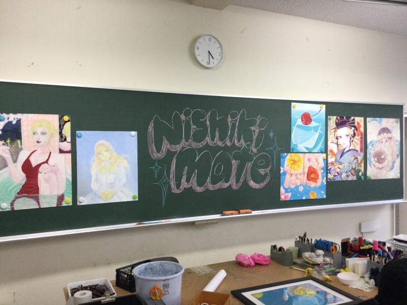 紫錦祭当日の作品は雨に濡れてしまったため、部員たちが新たに書き直し、完成した作品がこのたび玄関の壁面に展示されました。