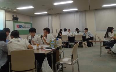 (写真は (上) 本校生徒が自己紹介している様子、(下) 熟議をしている様子 です)