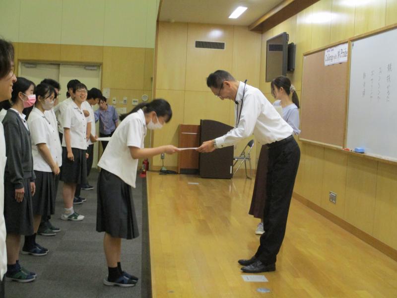 7月20日の4限目に、表彰伝達式・終業式・ALTのハナ・バラカリ先生の離任式が行われました。
