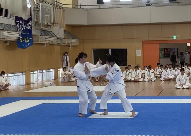 「いつも練習で相手とする際、動きが決まっているため安心してできていたが、そんなのがちゃんとした演武ではないということが改めて感じさせられた。今後の練習ではこの距離なら攻撃を当てられるんじゃないか・当てれるんじゃないかという意識を常に持とうと思う。」(2年・小川くん)