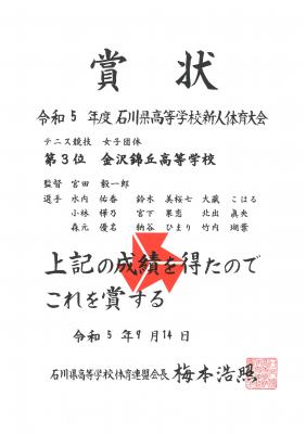 一般女子団体戦において本校ソフトテニス部が第3位に入賞しました。