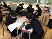 前時までに、名前など各自が刻りたい語句を決め、篆書字典で字形を調べて書き出した文字をもとに、印稿を作りました。今日は、布字(字入れ…印材に文字を写す作業)を行っています。書道の本間先生の説明の後、どの生徒も心をこめて丁寧に作業をしていました。この後、印刀を使って刻っていきます。世界に1つだけの自分の『篆刻』です。どのような作品ができあがるのか、みんなの完成を楽しみにしています。