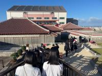 首里城は那覇の高台にあり、公園内もやや急な傾斜が首里城まで続いていました。階段も傾斜があり、生徒も登るのが大変そうでした。