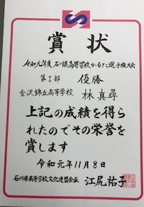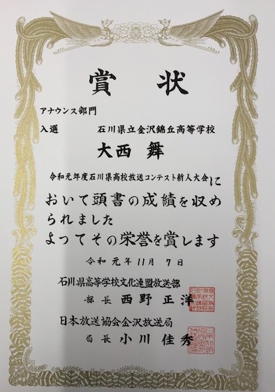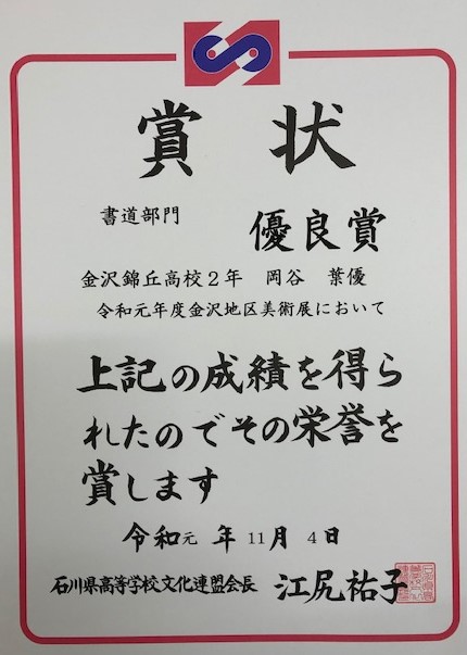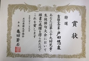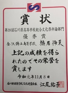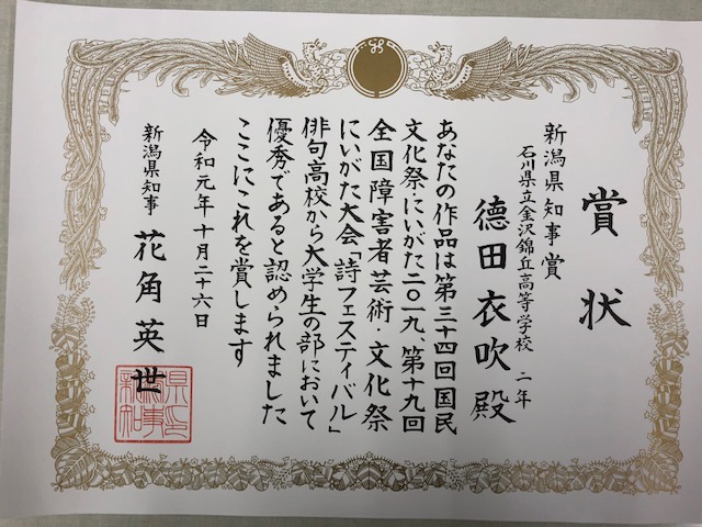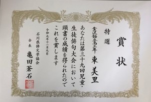 11月23日(土・祝)に、粟津演舞場にて、”第8回小松ビジュアル俳句コンテスト”の表彰式・記念セレモニーが開催され、本校の文芸部員である35Hの東美里さんが、高校生部門(「能順」の部)にて入賞しました!(なお、受賞者は1人のみでした!!)