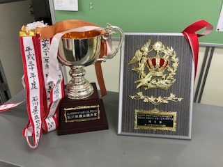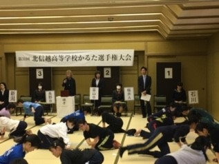 さて、12月7日(土)・8日(日)と福井県坂井市で行われた”かるた”の北信越選手権大会の団体戦に11Hの林真尋さん(右下写真の右奥の生徒)が出場しました。石川県チームは小松高校、金沢商業高校、本校の3校で計8人のチームを組んでおり、林さんは主将として他チームの主将たちと対戦し4勝1敗の好成績で、チームを牽引しました。引率の先生からの報告によると、「他県のチームは特に福井県芦原市などがかるた競技に力を入れており、思っていた以上にレベルが高かった。」ということで、結果は8チーム中6位であったとか・・・。次は個人競技に向けて、個々の力量を練習で高めていってもらいたいと期待しています。