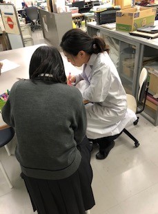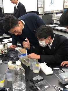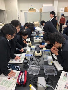 土曜日ではあったのですが、県立大学生物資源工学研究所の中谷内修先生や学生の方々などのご指導のもと、「電気泳動法によるDNAの分離・検出」の実験を行ってきました。生徒らは、マイクロピペットの使い方を学んだうえで、与えられたDNAを制限酵素(DNAの特定の部分に反応する)で切断し、長さが異なるDNAを、電圧をかけた寒天の入った装置に入れ、それらが移動した距離を別の装置で撮影し考察しました。休日返上で科学を学びにきた生徒らは、先生の説明をよく聞き、本校OGを含む学生のサポートも受けながら必要な操作を行い、後半にもなると大変スムーズな実験を行えるようになっていました。(「なかなかやるな。」とびっくりしました。)