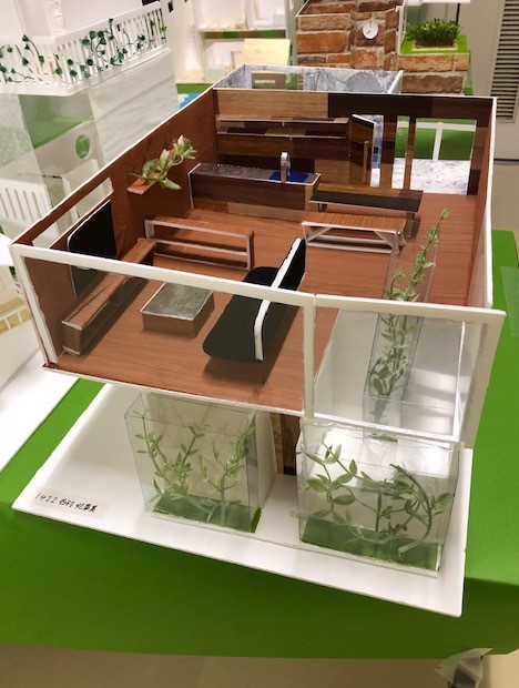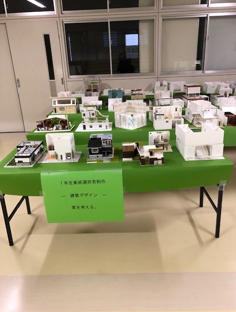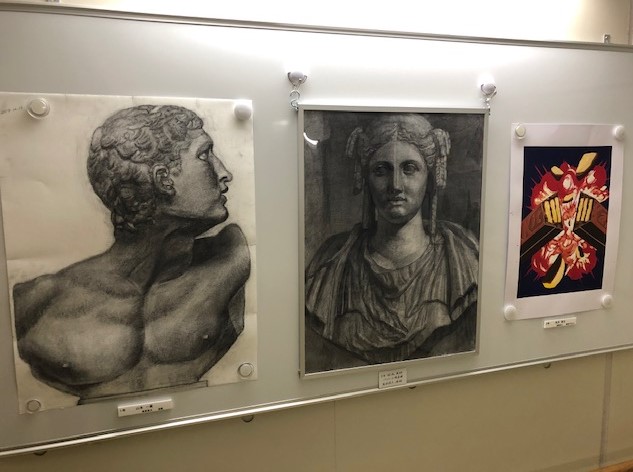 さて、中央階段踊り場の展示物は現在、生徒たちの作品になっております。美術選択者らの力作がずらりと並んでおりますので、2Fの”1年生の建築デザインの模型”とともに、保護者懇談会のお帰りの際にでもゆっくりとご覧いただきたいと思います。