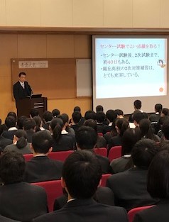 2学期終業式では、堀義明校長から1,2年生に向けて「自ら課題を見つけて、充実した冬季休業期間にするように」との訓示がありました。また、3年生に向けては「センター試験まで1か月を切りました。明日からのセンター練習会はいわば、練習試合です。本番での成功に向かって全力で練習会に臨むように」との訓示がありました。
