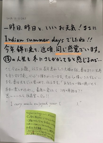 生徒たちは明日から1月6日(月)までの冬季休業期間に入ります。休業後、1,2年生には課題試験が行われます。新たな年に気持ちよくスタートがきれるよう、各人が何かひとつでも目的を果たすことができた達成感を持った有意義な時間にしてほしいと願っています。