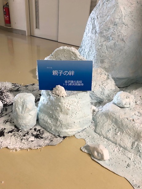 本校中央階段2階横の廊下に、ペンギンの親子が現れました。実はコレ、本校美術部の皆さんが時間をかけて制作し、県高校総合美術展に出品したものです。(優秀賞を受賞しています。)玄関から上がってきてふと彼らの姿をみると、本当に癒やされますよ。期間限定での展示中です。