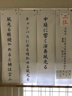 本校の図書室前には、生徒のつくった俳句が展示されています。日頃より、図書室では文芸部や図書委員の生徒たちが図書司書の先生のご指導の下、熱心に創作活動に励んでいます。嬉しいことに、本校の2年生チームが『俳句の甲子園』の北陸大会(6/8実施)で優勝して、8月に松山市で行われる全国大会に出場することとなりました。(万歳!)その生徒らの作品を是非ご覧ください。