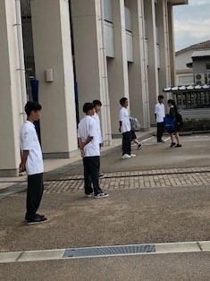 本校の朝は「おはようございます」の挨拶とともに始まります。4月当初から始業前に、学校長や生徒指導課の先生方が生徒玄関前に立たれて、ずっと声かけを続けております。(本当にありがとうございます。)今週は、サッカー部の諸君がこの声かけに加わり、頑張ってくれています。最初は声の小さい人もいたようですが、慣れてくるにつれて大きな声での挨拶ができるようになっているそうです。今週は天気の悪い日も多く、なかなか大変だったのではないでしょうか。(よく頑張りましたね。)元気な挨拶で、心はいつも晴れやかに!!