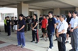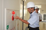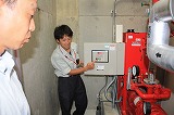金沢中央消防署員による消火栓の操作方法の説明の後、グラウンドに向けて一人ひとりが実際に放水訓練を行いました。また、防火システム・ポンプ停止などについての説明も受けました。