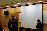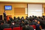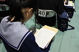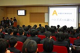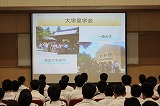 まず、視聴覚室で本校の概要説明がありました。副校長のあいさつの後、担当課から本校の教育課程や進路指導についての説明、さらに生徒代表から中学3年生への説明やアドバイスがありました。