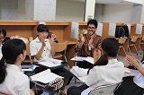 「ポジティブシンキング」について海外の大学生(グループリーダー)と意見交換をしました。緊張しながらも、お互いに自分の長所を3つずつ語ってみました。