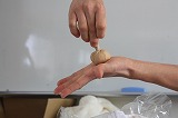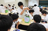 上皿ばかり上で、ピストン付きシリンダーを力を変えながら押し、加えた力の大きさを上皿ばかりで測って、そこから大気圧の推定を行いました。非常にシンプルな器具で大気圧を測定できることに、生徒たちは驚いていました。