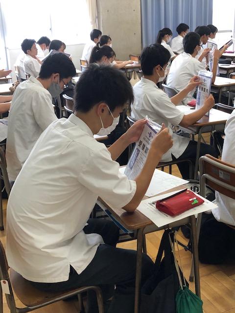 本日7限目のLHの時間、いよいよ3年生たちに”大学入学共通テスト”の願書が配付されました。ホーム担任から、使用する書類についての注意(願書には使用してはいけない書類も混じっているので要注意!)、願書記入上の注意などの説明があり、その後願書の下書きを行いました。この後、生徒たちは、金融機関へ検定料を納付し、その証明書を添付した願書を、期日までに学校へ提出することになります。(現役生は、学校から一括して願書を送付することになっております。)締め切り日等のめやすについては、3年学年通信9月号をご覧ください。