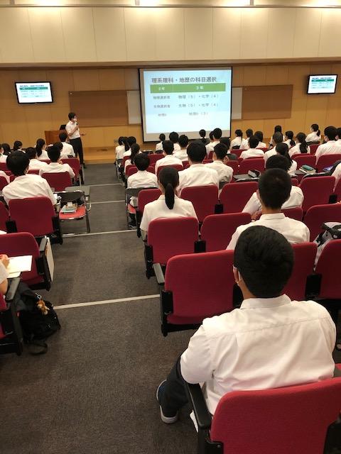 本日の7限目、2年生には「類型登録説明会」が行われました。これまでの学年集会のとおり、会場の視聴覚室には4クラスずつ生徒が入り、沖野教務主任からの説明を聞きました。(生徒たちはメモをとりながら真剣に説明を聞いておりました。)2年生における科目選択とは、文系ならば6単位分の授業を「文系数学特講」とするのか「地歴(公民)演習+実演英語」とするのかが、理系ならば4単位分の授業を「数学Ⅲ」とするのか「理系数学演習」とするのかということになります。いずれの選択でも自分の志望校と将来の「なりたい自分」をきちんと考えて行わなくてはなりません。9月18日(金)には仮登録することが必要となりますので、ご家庭においてもまたお子様にアドバイス等お願いいたします。
