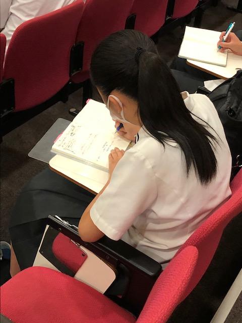 講師は、外務省経済局経済連携課の大西知子氏でした。実は、大西さんは、石川県津幡町のご出身で、県立桜丘高校をご卒業されました。外務省入省後、北京、ニューヨーク、上海などの海外勤務を経験され、国連にいらっしゃるときにはSDGsを制定されたそうです。生徒達からは、「いつ、どのようなきっかけで外務省を選んだんですか?」「外国語を学ぶコツは何ですか?」「これから著しく発展する匡はどこだと思いますか?」など、質問をし、大西さんからの丁寧な答えをメモしていました。