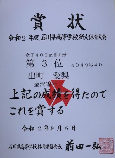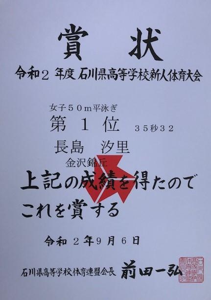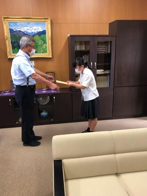 激励費の授与を受けた水泳部の12H穴太杏さんは「コロナ禍でも大会を開催してくださる運営に関わられるすべての人に感謝しながら、また中学時にライバルであった他校生に負けないようにもして、精一杯頑張ってきます。」と立派な挨拶をしてくれました。