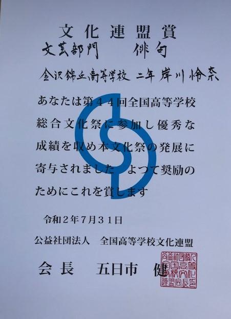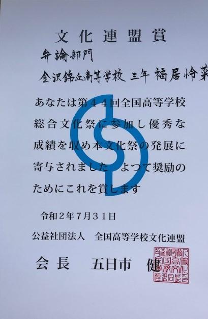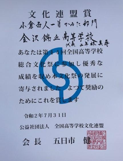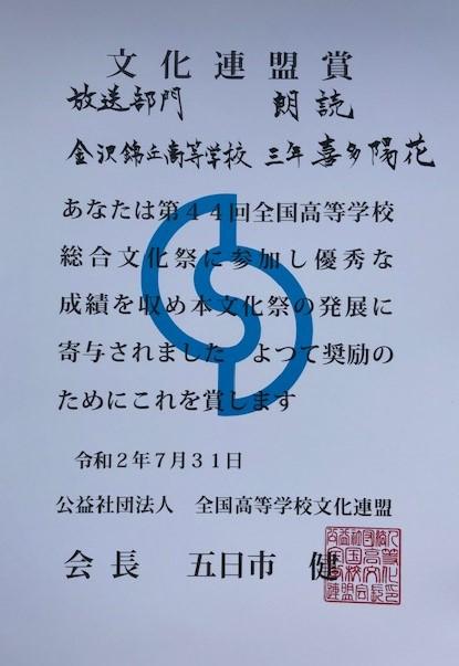 7月31日から(10月31日まで)web上で行われた「全国高等学校総合文化祭高知大会」に参加した本校生徒らに”文化連盟賞”の賞状が送られてきました。今年の「2020こうち総文」の放送部門には36H山田瑚子さんがアナウンスの種目で、34H喜多陽花さんが朗読の種目で参加しました。また、弁論部門には31H福居怜菜さんが、小倉百人一首かるた部門には21H林真尋さんが参加しました。さらに、文芸部門には28H岸川怜奈さんが俳句の種目で、28H加藤千晶さんが短歌の種目で参加しました。コロナ禍が早く収まって、次年度こそは通常の「全国高総文祭(和歌山県)」が行われることを願ってやみません。なお、校内での表彰伝達式を9月23日(水)に実施の予定です。