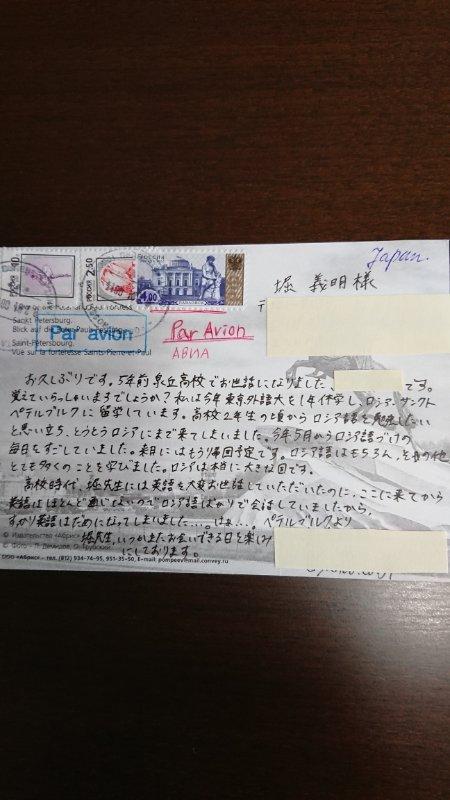 英語読みすると、「セント・ピーターズバーグ」、ロシア語読みすると、「サンクト・ペテルブルグ」から届いた絵はがき。この生徒は、泉で2年生の時、ホーム担任をし、1・3年生の時は授業を担当しました。東京外大用の個人添削も、最後まで担当しました。個人面談で、いかにロシアを愛しているか、熱く語っていましたっけ。「国連で働きたければ、第2次世界大戦・戦勝国言語を選ぶこと!大使館上級職員を目指したければ、国家公務員上級試験に対応するため、法学部を選ぶこと!通訳職を目指すなら、外国語学部を!」彼女の選択は、東京外大。東京外大進学の特権を1つ紹介。マイナー言語に特に顕著ですが、在学中に、東京の在外大使館に招待され、本場のお食事会付きの、大使主催の懇親会に参加できます。大使館側からすれば、公共のお仕事であれ、本国の企業への就職であれ、本国と日本との架け橋となる人材なわけで、それくらいの歓待はお安いご用なのです。ちなみに、大使館の敷地内は日本であって、日本ではない区画となります。完全治外法権で、誰でも入場できるわけではなく、入退場は厳しく管理されています。門の前には、必ず警察官が24時間体制で警護の任に当たっています。大使館入館というのは、国際空港で、パスポート提示して、出国手続きするのと同じことなのです。彼女との会話。「先生。本場のピロシキって食べたことあります?めっちゃ美味しいんですよお。」「ありませ~ん。ロシア、行ったことないし。」「私もまだ行ったことないんですけどお。この前、また、大使館に招待されてえ。美味しかったあ。できたて、最高なんですよお。」彼女、007のごとく(?)、確実にロシアに接近してました。『なりたい自分』になるべく、学歴を踏み台に、その特権や人脈を存分に「利用」し尽くしてました。もともと、肌が白い子で、北欧っぽい顔立ちだったなあ。(ちなみに、英語の「St」<saintの略:読みは「セイント」or「セント」っぽく>や「San<読みは「サン」>」、「Santa」<読みは「サンタ」>は、日本語では「聖」の意味で、宗教色強し。その後にくっつくのは、最初にその地の入植した宗教家<キリスト教多し。植民の歴史とも関係大。>の代表者の名前が多く、地名となっている例多し。例えば、「セント・ルイス」「サン・フランシスコ」「サンタ・モニカ<モニカは珍しく女性名>」等のアメリカの地名のみならず、世界中に点在。こういう視点で言葉を意識すると「あっ」て気づくことが爆発的に増えます。「セント・バーナード」という寒さに強く、気は優しく力持ちの大型犬は、ヨーロッパ山中の雪深いところにある有名な巡礼地「セント・バーナード寺院<バーナード修道僧が開いた寺院>」で開発された犬。冬、大雪が降っても、お参りに来る人が絶えず、吹雪の中、遭難する人が続出。その救難活動において、遭難者を発見したら、そりに乗せ、寺院や麓まで運ぶ。そんな時、真冬でも力強く、黙々とそりを引っ張る人命救助犬だったのです。「バーグ」は「街」の意。なので、「セント・ピーターズバーグ」は「ピーター修道僧の街」くらいの意味なのです。「サンクト・ペテルブルグ」は「ペテル修道僧の街」くらい。「セント・フォース」はキレイなニュースキャスターの集まり。なんのこっちゃ?)今日はこの辺で。CU ASAP! & TGIF!!