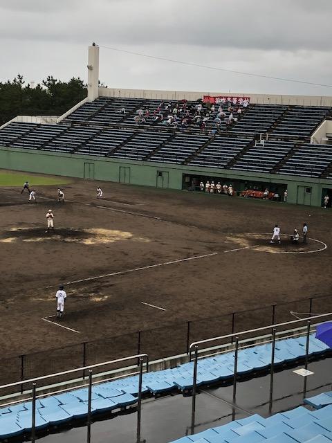 9月13日(日)の午後、第143回北信越地区高等学校野球石川県大会の1回戦が小松弁慶スタジアムで行われ、本校野球部は羽咋高校と対戦しました。小雨の続くあいにくの天気のなか、選手諸君は精一杯頑張ってくれ、部員の保護者の方々の熱い応援(部員保護者のみ応援可、ただし、大声禁止、拍手のみという制約あり)もありましたが、残念ながら結果は4-8で悔しい敗戦となってしまいました。応援をいただきました皆様方、本当にありがとうございました。