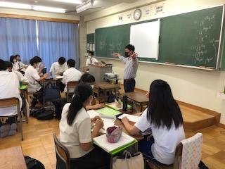 単元は「世界の気候」。気候要素の一つである気温の「日較差」と「年較差」をシンガポールを例にとって学習しました。シンガポールは熱帯のため、日較差は7.0℃に対して、年較差は1.8℃だそうです。(金沢の年較差は20℃以上!だそうです。大きな違いですね。)生徒達は、地図帳を開いてシンガポールの位置を確かめたり、平均気温のデータから年較差を導き出したりしていました。筆者が高校生の頃の地理は、1対1で暗記することがとても多かったと記憶していますが、現在では、与えられたデータから何が読み取れるのか、それをどのように言葉で表現できるのかも学びます。生徒たちは、お互いに意見を交換したり、答えのチェックをしたりしながら、主体的に、Activeに、授業に参加していました。