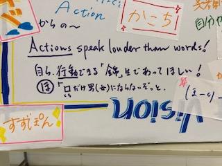 前回と同じく、終始会は大変な盛り上がりになりましたが、特に最後に行った”クローズセッション(まとめ)”では、自分の意見を皆の前で述べてみたい参加者の手がたくさん上がり、それぞれの考えを共有できました。「敬語 ノット イコール 壁」(敬語を使っても壁を築くわけじゃない)、「『される』関係から『双方向』の関係へ」、「自分から行動する!」、「色々な距離感があっていい。そうして『大人』を学ぶんだ」など、ふだんの授業では決して聞けない参加者たちの(大人びた?)本音のトークにみな笑顔になり、意見を述べた人への敬意の拍手が続きました。(本当に良い雰囲気になっていました。)