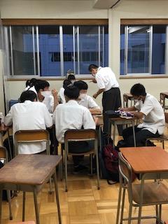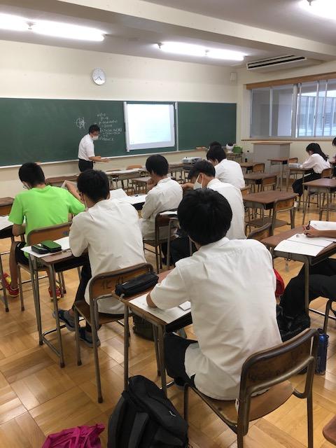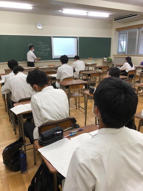 さて、このようななか、放課後の講義室では2年生の有志たち約20名が学習会を行っていました。新田学年主任の指導のもと、数学の応用問題の解き方を学んでいたようで、皆さん真剣な面持ちで頑張っていました。9月25日(金)は本校の創立記念日であり生徒たちは休みとなりますが、2年生の希望者はこの日に”駿台全国模試”(←問題がかなり難しい)を受けることになっています。本校には「なりたい自分」を目指して、運動で頑張っている人、自分の技能・技術等を高めることに頑張っている人、勉強で頑張っている人など、多様な方向性を目指す人材が集まっています。勉強会は、明日も続けられるそうです。(ファイト!!)