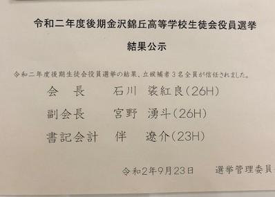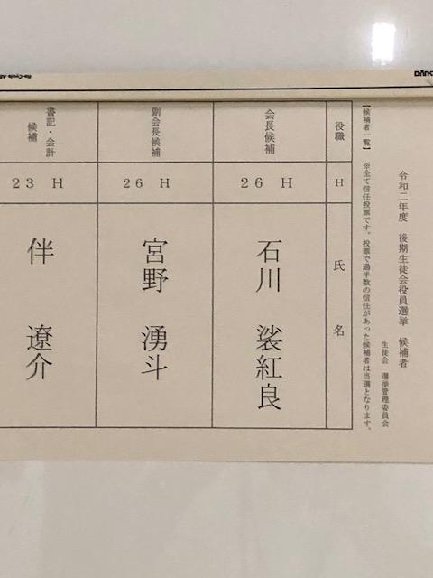 現在、後期の生徒会役員の候補者が公示されています。生徒会長候補者は前期と同じ26Hの石川裟紅良さん、副会長候補者は26Hの宮野湧斗さん、書記・会計候補者は23Hの伴遼介さんです。9月23日(水)に信任投票が行われる予定となっています。コロナ禍のなか、前期の生徒役員や総務委員の皆さんの尽力で、素晴らしい「新しい生活様式での紫錦祭」を行うことができました。後期の生徒会活動もよろしくお願いします。