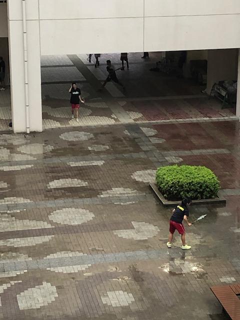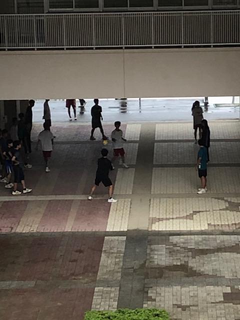 雨の日の放課後のNスクエアでは、ハンドボール部、ソフトテニス部、テニス部、弓道部などの生徒たちが雨のあたらない狭いスペースを使って練習をします。スポーツは天候の影響を受けざるをえないものだとは認識しておりますが、狭いところでも工夫しながら何とか体を動かしている彼ら彼女らをみていると、大きな体育館があるといいな、などとつい思ってしまいます。この時間のこの場所では、錦丘中学生の練習している姿もみられ、本校が併設型中高一貫教育校であることを改めて感じることができる瞬間です。