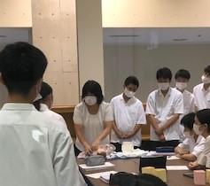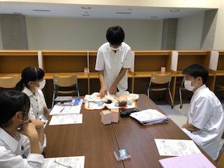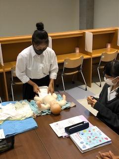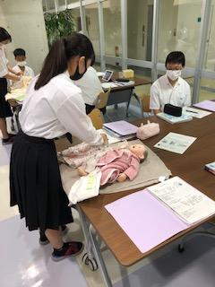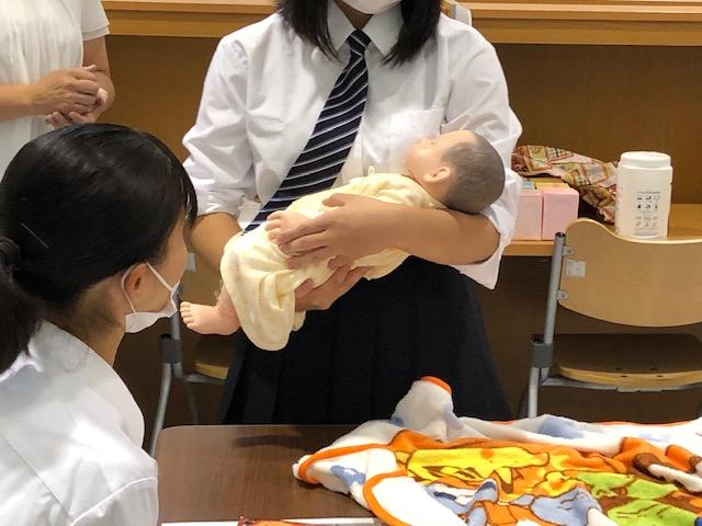 昨年は「本物の」赤ちゃんがやってきて、実際に抱っこなどをさせていただいたそうですが、今年はコロナ禍ということでそれも叶わず、県立看護大学にお願いして、看護師実習でも使うお人形で挑戦しました。