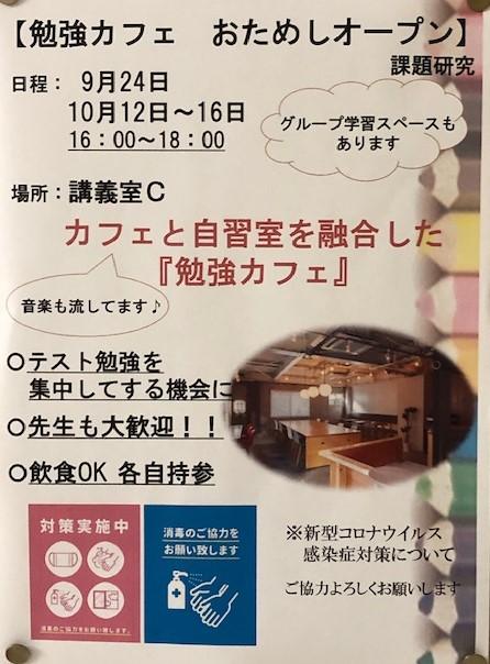 2学期中間試験の1週間前になっていますが、中央階段踊り場の掲示板に1枚の案内ポスターが・・・・どうやら、2年生のある研究グループが、研究仮説を検証するデータをとるために、校内で”勉強カフェ”を開設してみるようです。今年度の2年生の課題研究では、他者へのアンケートや聞き取り調査だけではなく、大がかりな行動実践を行ってみようとするグループが出てきています。