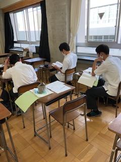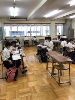 また、物理講義室では、今後行われる模擬試験に向けて、理科の定期試験の解き直しを行っている3年生たちの姿をみることができました。大学進学を志す全国の3年生ほぼ全員が受験する記述型模試は、10月に行われるものが最後となります。(これ以降も、マーク型模試や難関国立大学用の記述型模試は実施されていきますが・・)定期試験の内容で徹底的に基礎を固め、できれば1冊に決めた受験用問題集の問題を何回も解いて応用力を高め、しかるべき準備をし、目標を持って、次の模試に臨んでいくのが受験勉強なのだと考えます。本番が一番大切なのはいうまでもないことですが、これまでの模試の自己ベストを超えられる3年生がたくさん出てくれることを期待しています。