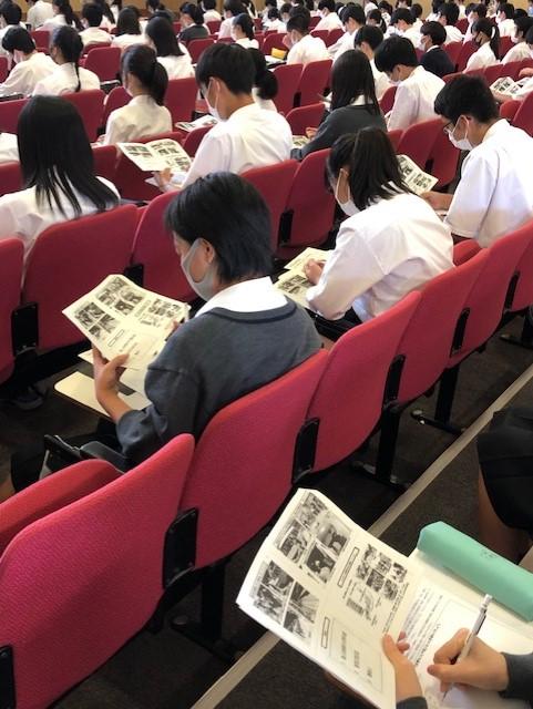 本日の1年生の6,7限目は課題探究の時間となり、陸上自衛隊の方を招いて、防災・減災の具体策を考えるために必要な知識・事例等について学びました。生徒たちは、2クラス交代で視聴覚室に集まり、陸上自衛隊が近年対応してきた様々な災害現場の写真を見ながら、防災・減災について学んでいきました。災害現場の大変さや隊員の方々の活動・活躍に緊張感や敬意を感じながら、ときおり、現場に出られた自衛隊員の方の生の「心の声」なども紹介されることもあり、非日常におかれた人間心理等も学べる有意義な時間となりました。今後、「防災・減災プロジェクト」に取り組むグループの生徒たちは今回の学びを活かした研究を進めていくことになります。また、「商店街活性化プロジェクト」に取り組むグループの生徒たちには、自身の防災意識を高める良い機会としてほしいと願っています。