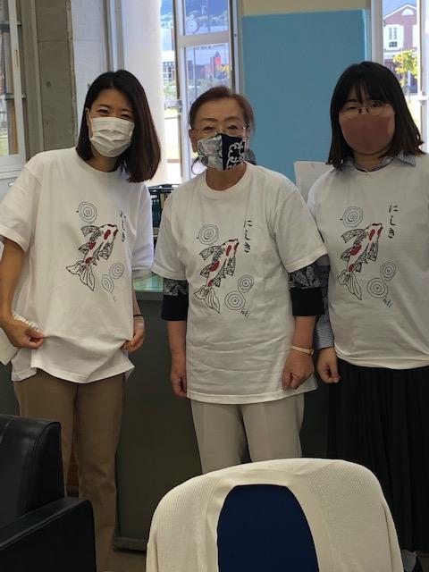さて、現在本校の事務室には6名の職員の方々が在室されており、日頃より本校の教育活動を支えてくださっています。今日の事務室では、職員の方々全員が同じ柄のTシャツを着て執務を行っていらっしゃって、部屋に入った筆者はちょっとビックリ!Tシャツには、”錦愛”溢れるデザインがプリントされており、聞くところによると、職員の一人である間戸(まと)遥香さんによって書かれたもののようです。皆さん、とっても仲のよい雰囲気で仕事をされておられたのが大変印象的でした。(大職員室や進路指導室も負けませんぞ!)