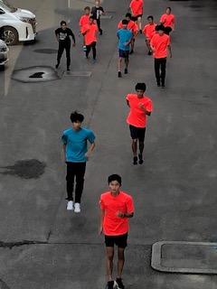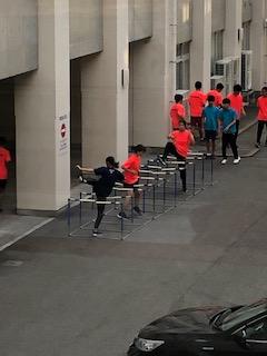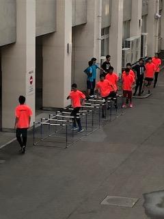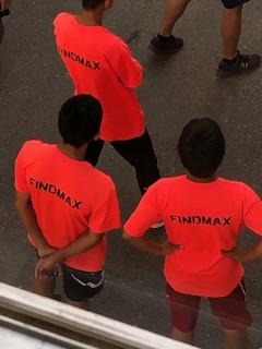 整然と並んで、大きく一歩を踏み出したり、全力で走ったり、ハードルを使って体の向きを変えながら乗り越えて行く練習など、見ていて飽きないものでした。彼らの着ているTシャツは鮮やかなオレンジ色、よく見ると「FINDMAX」と書かれています。(これはFind Your Maxから来ているのかな?そうとしか思えない!)