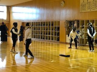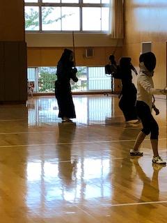 体育館の2階には、柔道場や剣道場があります。剣道場を訪れると、フェンシング部と剣道部が練習していました。